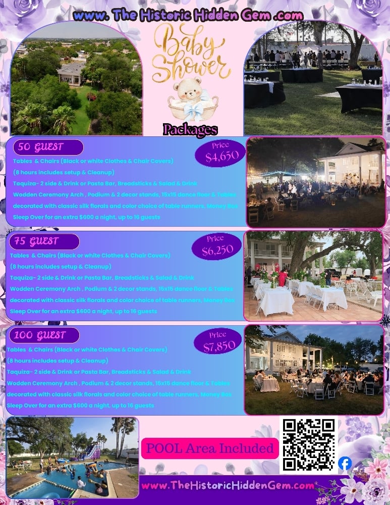 Celebrate your special day in a beautiful, one-of-a-kind setting at The Historic Hidden Gem in San Juan, Texas. Our all-inclusive baby shower packages are designed to make planning effortless while creating a stunning and memorable experience for you and your guests.