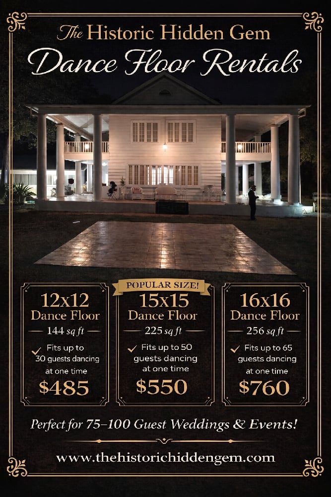 Elevate your celebration with a stunning dance floor set against the timeless beauty of **The Historic Hidden Gem**. Whether you're hosting a romantic wedding, elegant quinceañera, corporate gathering, or private celebration, our premium dance floors create the perfect focal point for unforgettable moments.